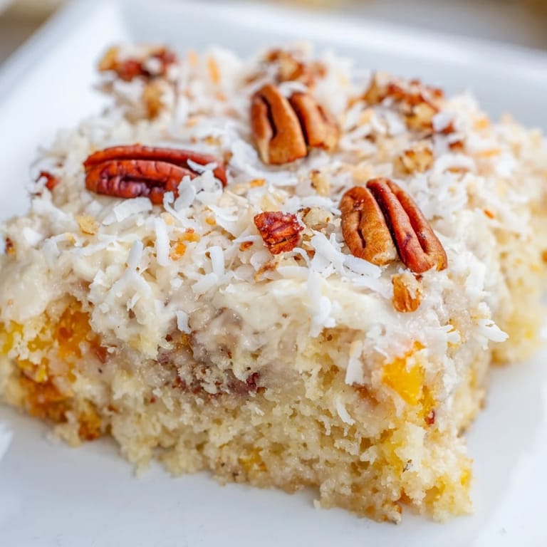 The hot coconut frosting is what separates this dessert from a basic fruit cake. By pouring it over the warm cake, you're creating something more like a tres leches cake—tender, soaked through, almost liquid in places. The pecans or walnuts aren't just decoration; they add a slight bitter note that balances all that sweetness and makes people reach for another slice.