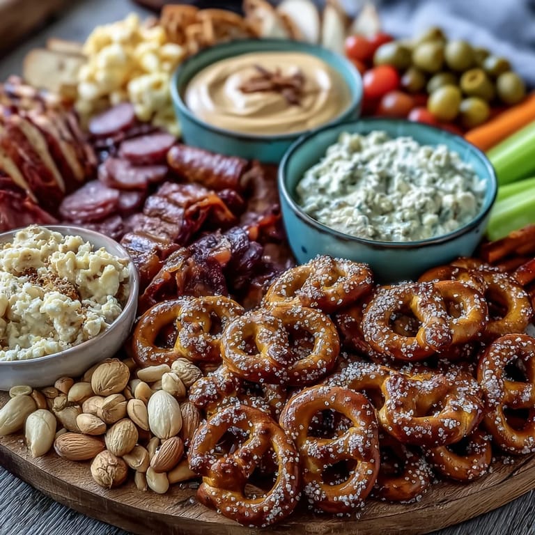 Pin Now My buddy texted me last minute about hosting a watch party, and I had exactly two hours to pull something together that wouldn't scream "I forgot." I raided the grocery store with zero plan, just grabbing things that felt right—pretzels, cheeses, whatever looked good—and somehow ended up with this gloriously chaotic snack board that became the star of the game. Nobody cared about the final score because they were too busy loading up on pretzel bites dipped in beer cheese and arguing over the last handful of salami.