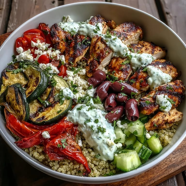 If you don't have quinoa, bulgur or farro work beautifully and give the bowl a slightly chewier texture. Swap the chicken for shrimp or lamb if you want to mix things up, just adjust the grilling time. For a dairy-free version, skip the feta and tzatziki and drizzle with tahini thinned with lemon juice and water. You can also roast everything in the oven at 425 degrees if you don't have a grill, it won't have the same smokiness but it's still delicious.