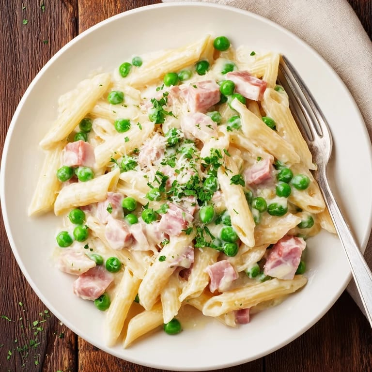 Pin Now The first time I made this pasta was on a rainy Tuesday when I had leftover ham from Sunday dinner and a bag of peas staring at me from the freezer. I wasn't expecting much, just wanted dinner on the table quickly. But something magical happened when that creamy sauce hit the sweet peas and salty ham. My husband took one bite and said, this needs to happen again soon. Now it's our go-to when we want something comforting but not heavy.