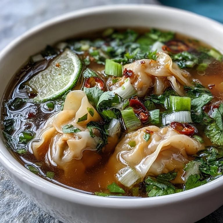 - Ladle the soup into bowls, making sure each one gets a generous share of wontons, vegetables, and broth, then top with fresh coriander, sliced spring onions, lime wedges, and a drizzle of chili oil if you want extra heat. Serve immediately while the flavors are singing.